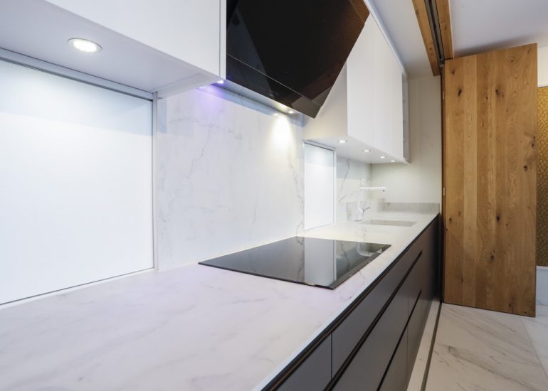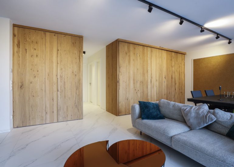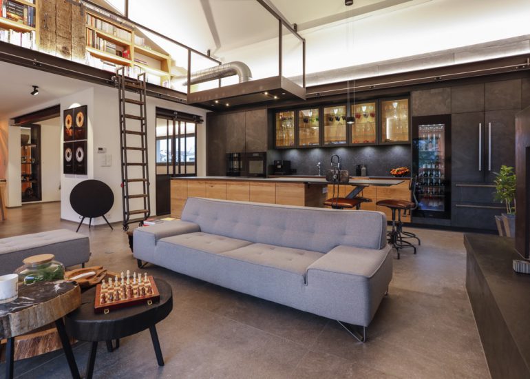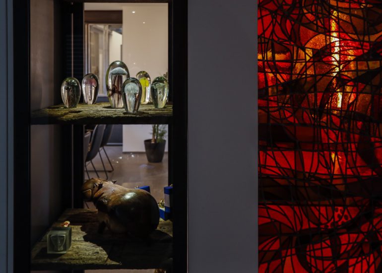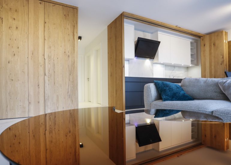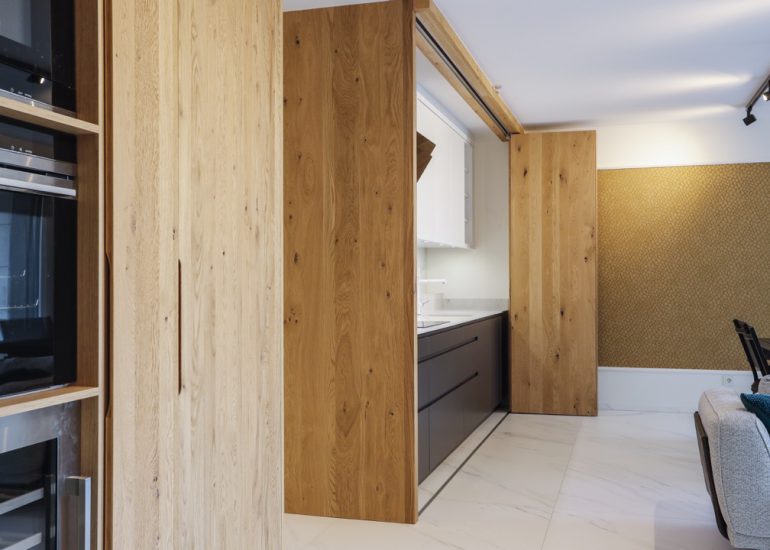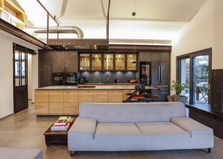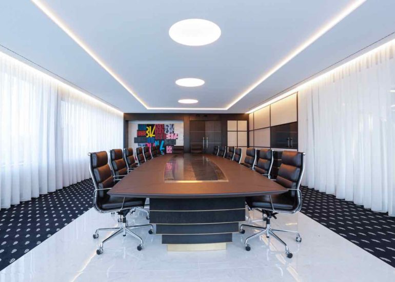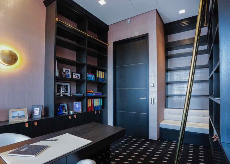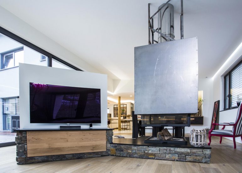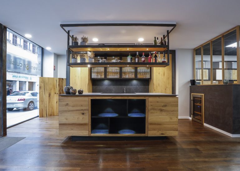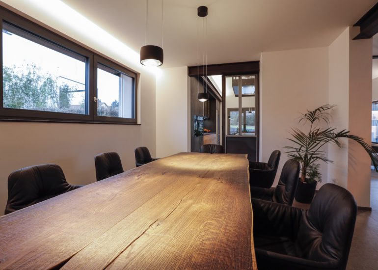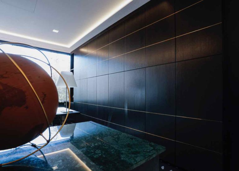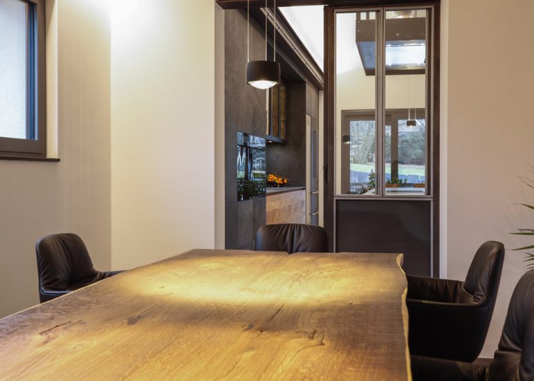 Réalisation d'un bureau sur mesure en laiton avec système informatique intégré qui se relève lors de réunions.